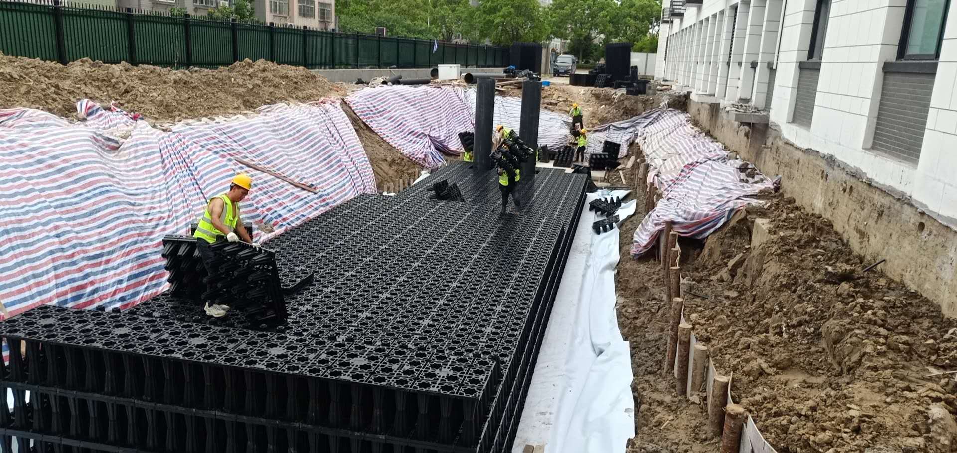 該項目雨水回收系統采用地埋PP模塊組合水池的方式收集雨水,前期經過截污掛籃、棄流過濾,后期通過地埋一體機過濾,消毒,最終使水質達到規范標準,用于廠區綠地的澆灑,景觀補水,道路沖洗。